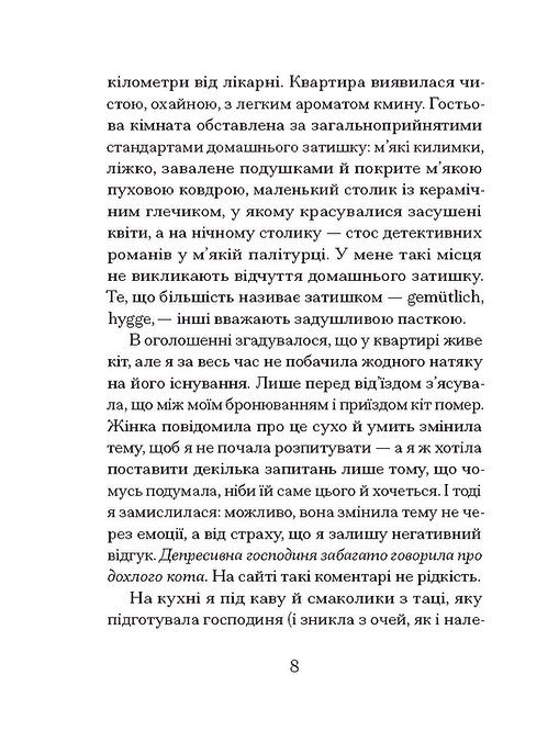 Це книжка про емпатію та про те, що ми можемо зробити одне для одного набагато більше, ніж ми, можливо, думаємо: просто уважно слухаючи. Роман, який водночас є портретом того, що означає бути живим саме зараз. Поетична і легка, як пір'їнка, книжка, яка дарує надію і велику радість.