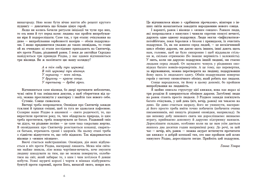 Серед текстів — як добре знані класичні твори, так і ексклюзивні нові оповідання, написані українськими авторами під час повномасштабної війни. Їхні історії — це відображення нашої сучасності, у якій Різдво стає символом незламності, єдності й віри у світло попри темряву. Це книжка, яка пахне імбиром, воском і старими сторінками. Вона повертає читача до витоків — до віри в добро, силу світла і чудо, що завжди приходить, коли ми найменше на нього чекаємо. Це збірка, що зігріває серце й нагадує: навіть у найхолоднішу ніч народжується світанок.