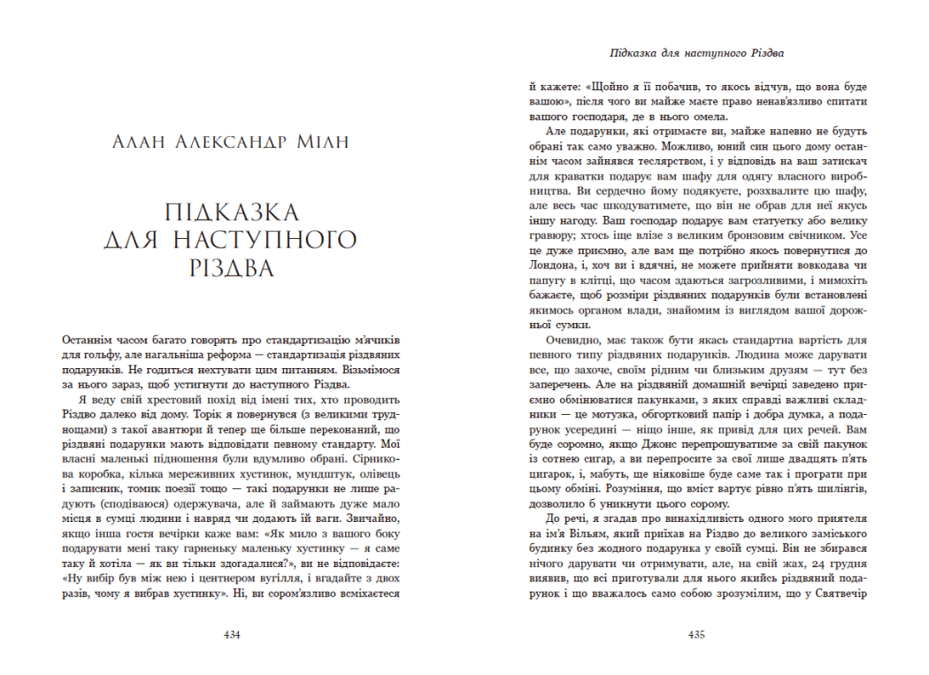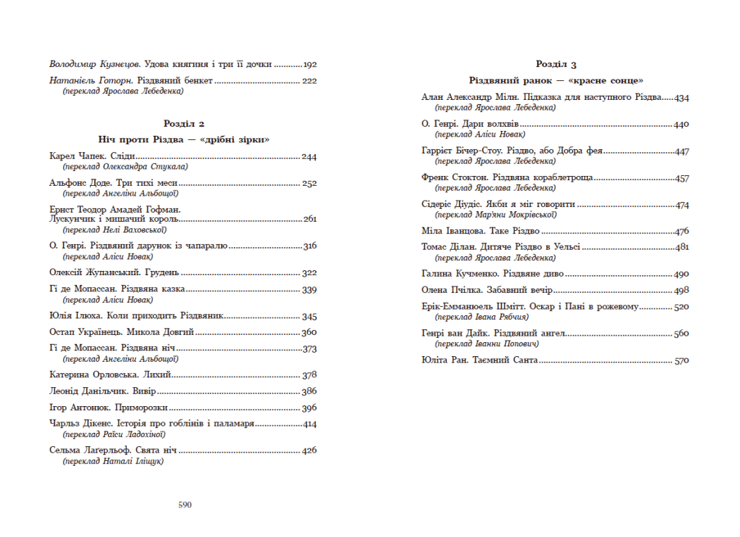 Містить твори таких авторів: Ернст Теодор Вільгельм Гофман, Алан Александр Мілн, Гаррієт Бічер-Стоу, Гі де Мопассан, О. Генрі, Чарльз Дікенс, Володимир Винниченко, Олена Пчілка, Дара Корній, Остап Українець, Олексій Жупанський, Ігор Антонюк тощо.