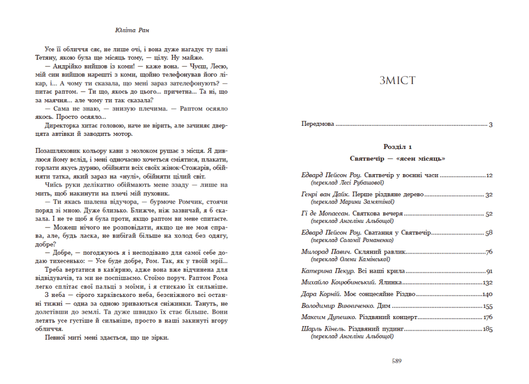 Святкова антологія, що відкриває багатогранність різдвяного духу у всій його глибині. Тут вміщені 39 оповідань від 34 письменників і письменниць — від світових класиків, як-от О. Генрі, Чарльз Дікенс, Гі де Мопассан, Ернст Теодор Амадей Гофман, Сельма Лаґерлеф, до українських майстрів слова — Михайла Коцюбинського, Олени Пчілки, Міли Іванцової, Дари Корній, Остапа Українця та інших. Кожен із них говорить про Різдво по-своєму — через любов і втрату, віру і сумнів, добро і боротьбу зі злом.