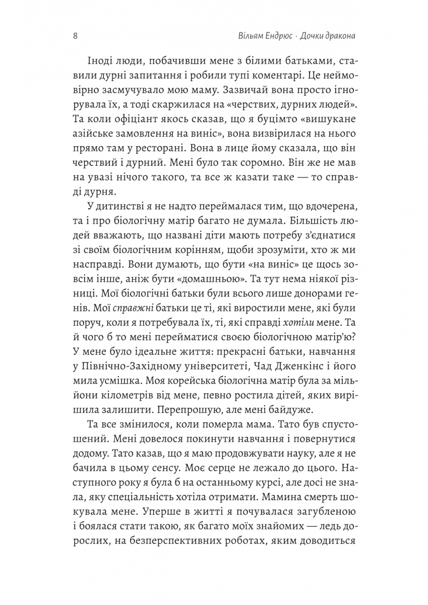 У дитинстві я не надто переймалася тим, що вдочерена, та і про біологічну матір багато не думала. Більшість людей вважають, що названі діти мають потребу з’єднатися зі своїм біологічним корінням, щоби зрозуміти, хто ж ми насправді. Вони думають, що бути «на виніс» це щось зовсім інше, аніж бути «домашньою». Та тут нема ніякої різниці. Мої біологічні батьки були всього лише донорами генів. Мої справжні батьки це ті, які виростили мене, які були поруч, коли я потребувала їх, ті, які справді хотіли мене. Та й чого б то мені перейматися своєю біологічною матір’ю?