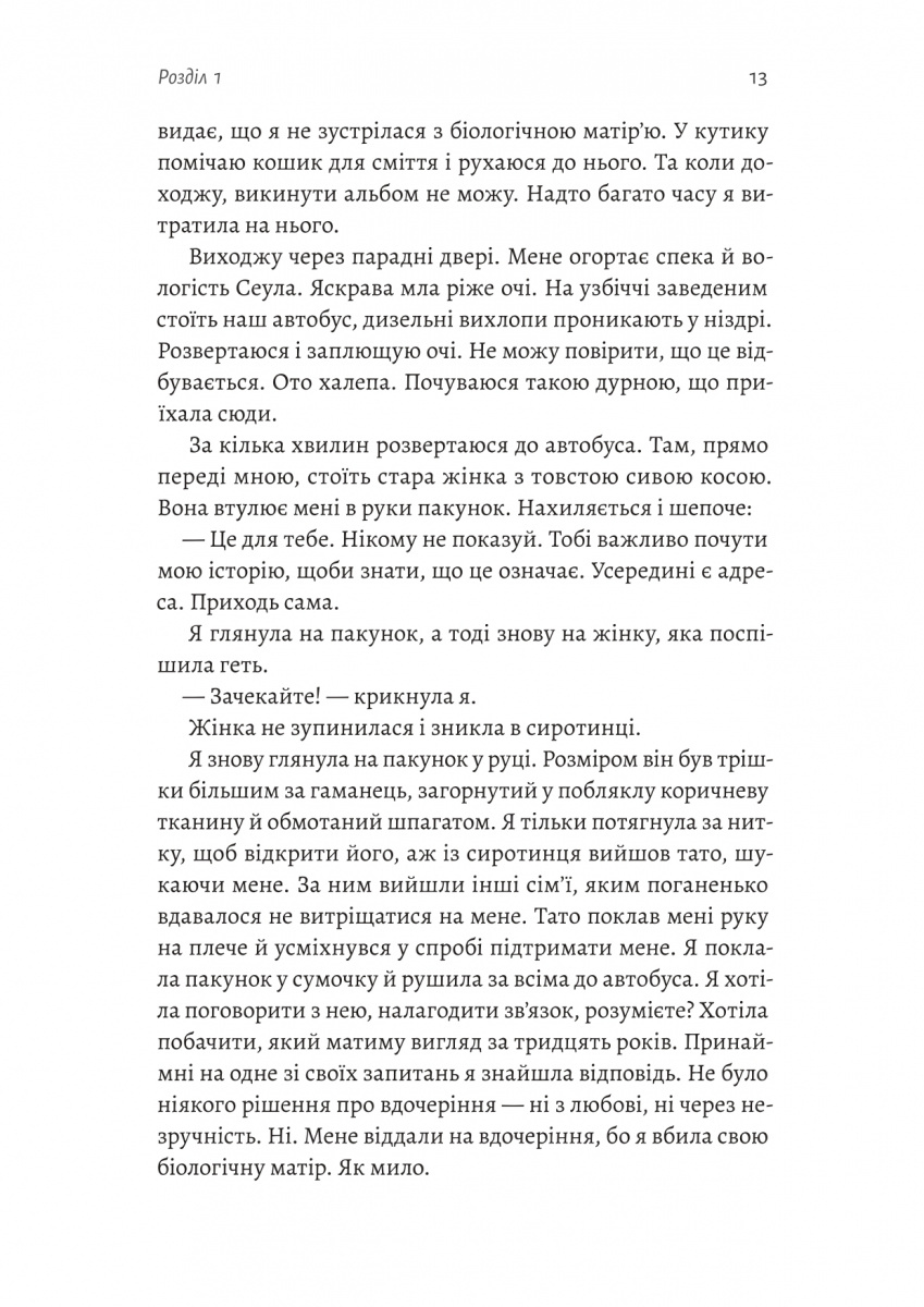 Маємо бути сильними. Маємо допомагати одна одній. Після слів Су Хі мені стало не так страшно. Тоді я зрозуміла, що хоч вона не була такою гарною, як мама, і не була такою розумною, як тато, Су Хі була ними обома — небом і землею. Як мама, вона заземляла мене. Ми були в жахливому місці, і я мала навчитися дисципліни, щоб вижити. Але, як і тато, вона змушувала мене повірити, що мені вдасться.