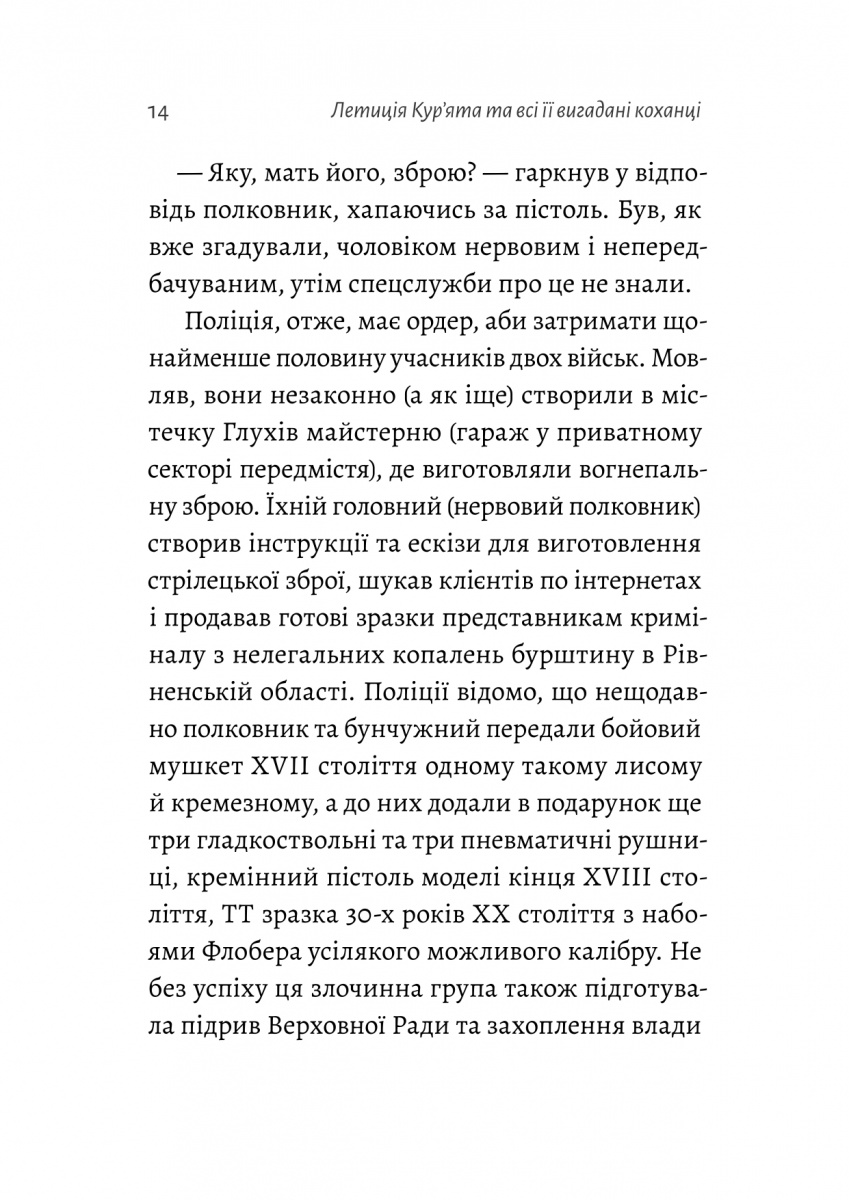 «Летиція Кур'ята та всі її вигадані коханці, яким вона збрехала про свого батька» — це суміш гумору, сарказму, поетичних алюзій, магічного реалізму і автобіографічної історії з елементами репортажу. І спроба описати вразливість у світі, де війна стає буденністю, а любов — рятівною ілюзією.