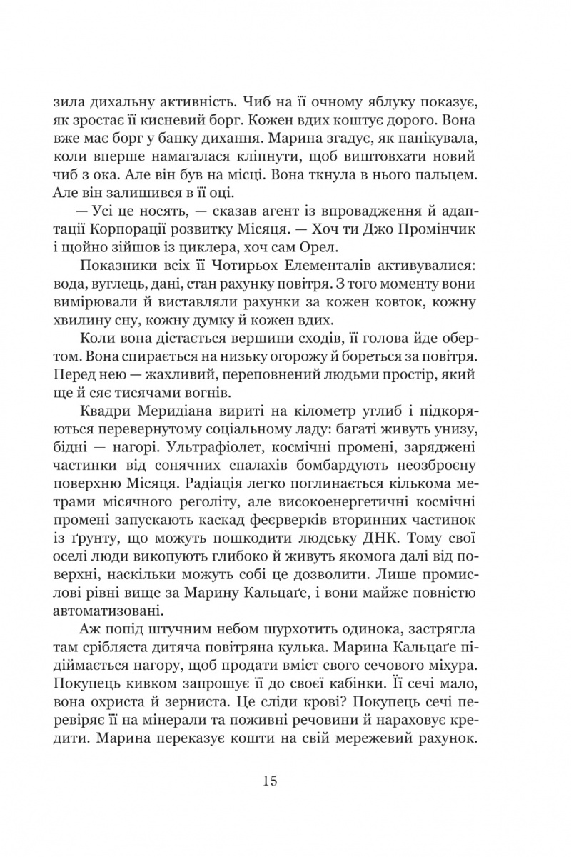 - Роман знайомить читачів із Місяцем майбутнього, де панують п’ять впливових династій, що контролюють головні ресурси: енергію, повітря, воду й родючий ґрунт.