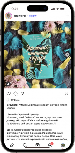 Цікаво було зазирнути у внутрішній світ героїні, книга написано легко, тут є напруження й гумор, майже детективна лінія і багато любові одного пташино серця….