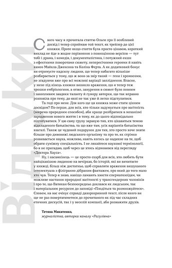 - Унікальний погляд ізсередини: книжка написана ембріологинею, яка щодня працює з тим, що більшість людей бачить лише у фільмах чи медичних статтях.